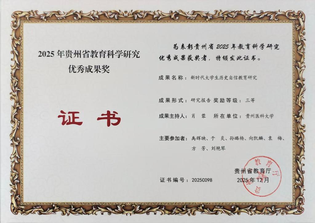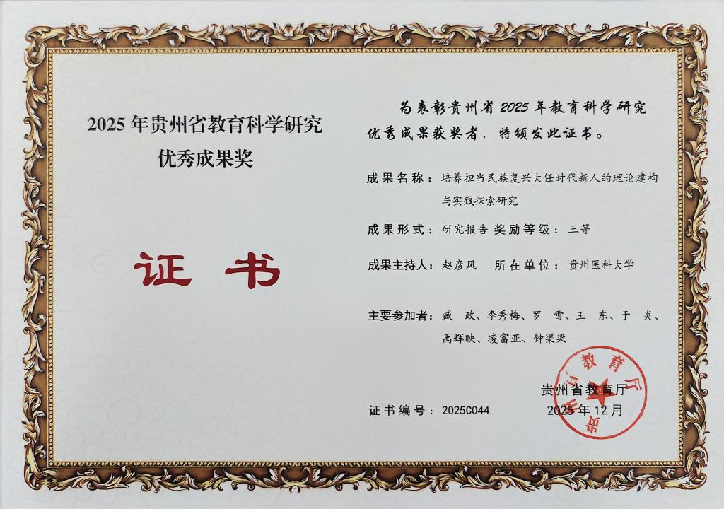 近日,贵州省教育厅公布了2025年教育科学研究优秀成果奖评选结果,我院喜获3项奖项,展现了在教育科学研究领域的扎实实力。此次获奖成果涵盖终身教育、时代新人培养、大学生历史自信教育等方向。其中,王琴申报的《逻辑・价值・实践:终身教育赋能教育强国研究》(论文)荣获二等奖;赵彦风申报的《培养担当民族复兴大任时代新人的理论建构与实践探索研究》(研究报告)、肖蓉申报的《新时代大学生历史自信教育研究》(研究报告)均获三等奖。