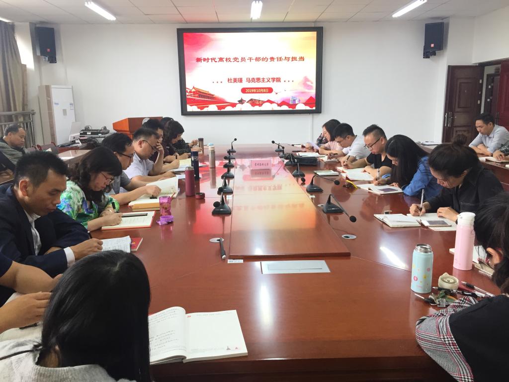 杜美瑾作题为“新时代高校党员干部的责任与担当”的中心发言,她强调,要深刻理解马克思主义责任观的理论基础,坚守共产主义理想信念。从三个方面坚持全心全意为人民服务的根本宗旨,一是牢记担当之责,树立为民务实的形象;二是强化立德树人之根本,践行“八个统一”的育人要求;三是强化科教兴国之使命担当,落实“四个服务”的发展要求。最后她对如何全面提升新时代高校党员干部的使命担当作了详细阐述。