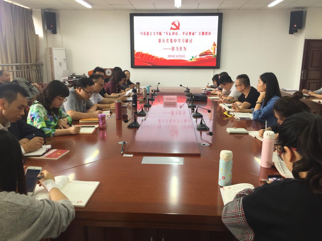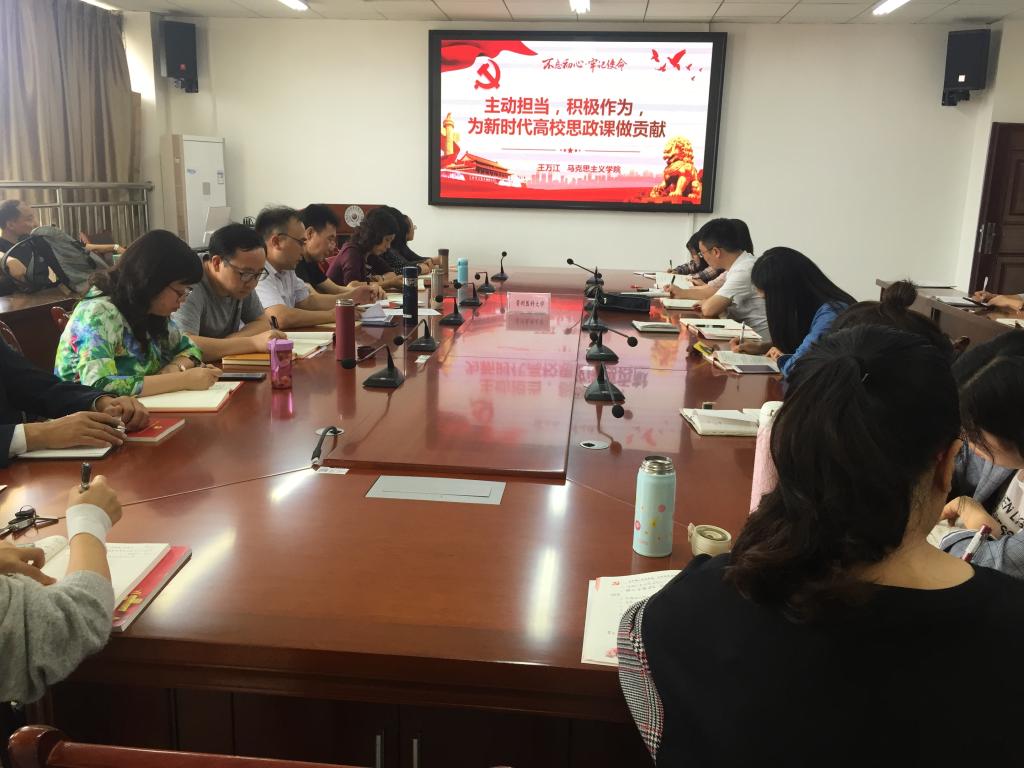 韩贞习领学《习近平关于“不忘初心、牢记使命”论述摘编》中“新时代要有新气象,更要有新作为”相关内容。王万江作题为“主动担当,积极作为,为新时代高校思政课做贡献”的中心发言。他详细解释了“担当”的内涵,并提出要按照习近平总书记对新时代党员干部担当的基本要求:面对大是大非敢于亮剑;面对矛盾敢于迎难而上;面对危机敢于挺身而出;面对失误敢于承担责任;面对歪风邪气敢于坚决斗争。他强调,要深刻认识担当精神的重大意义。从三个方面积极做新时代担当作为的高校思政课教师,一是增强新时代思政课教师的责任感和使命感,二是厚植新时代思政课教师的政治底蕴,三是提升新时代思政课教师的教学能力。